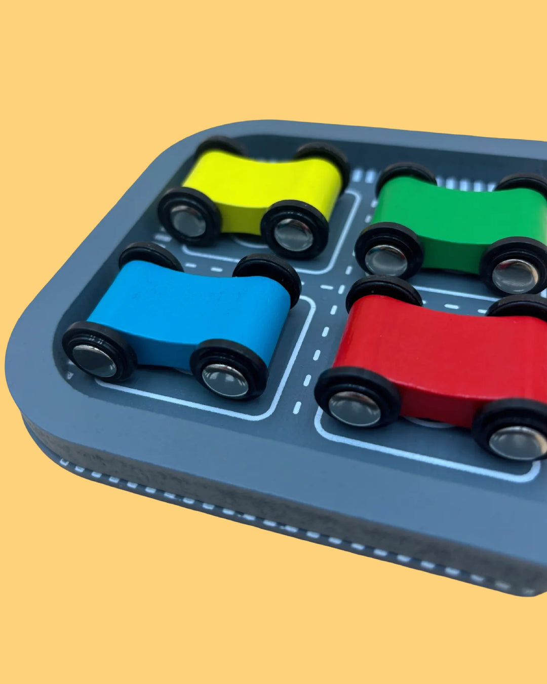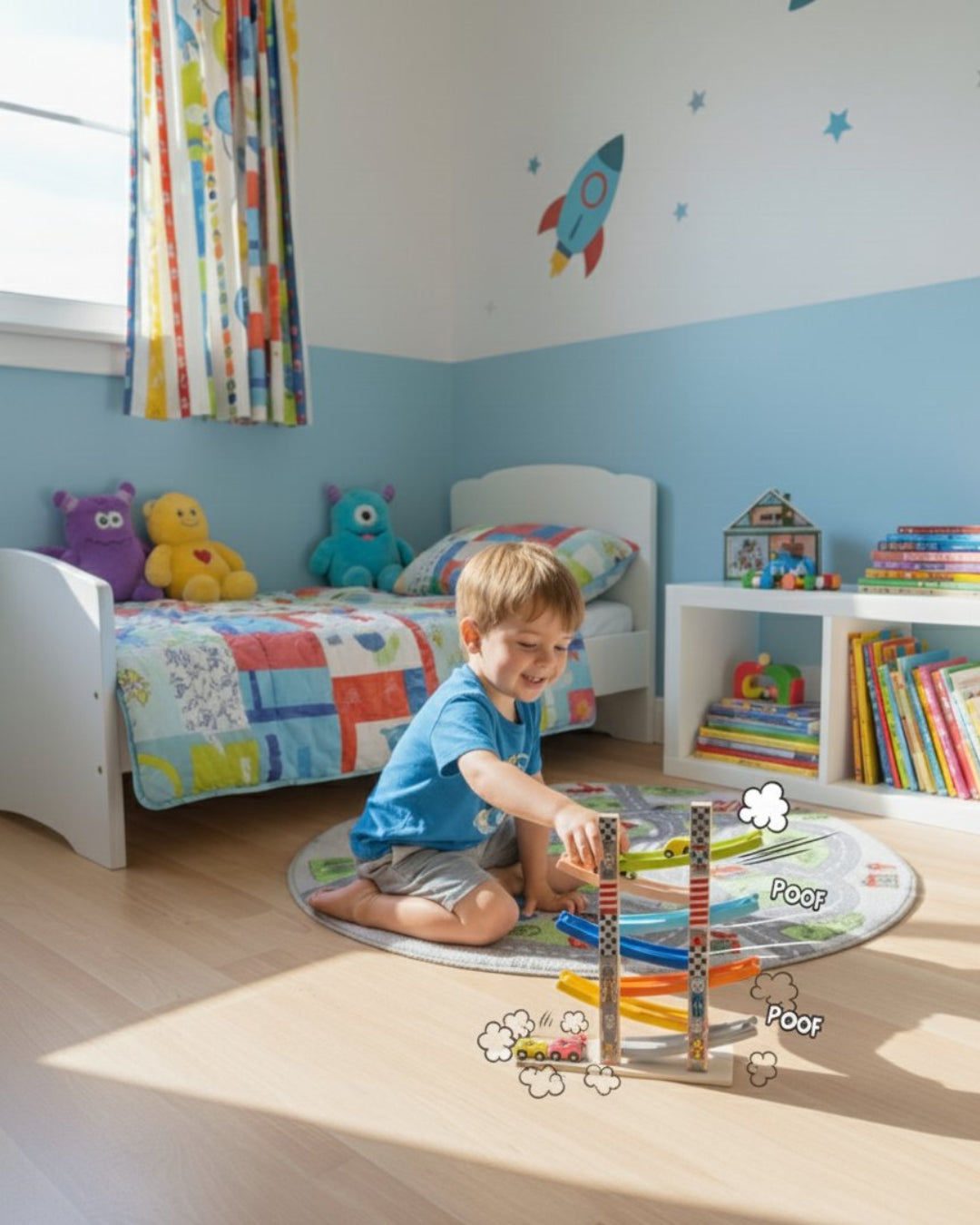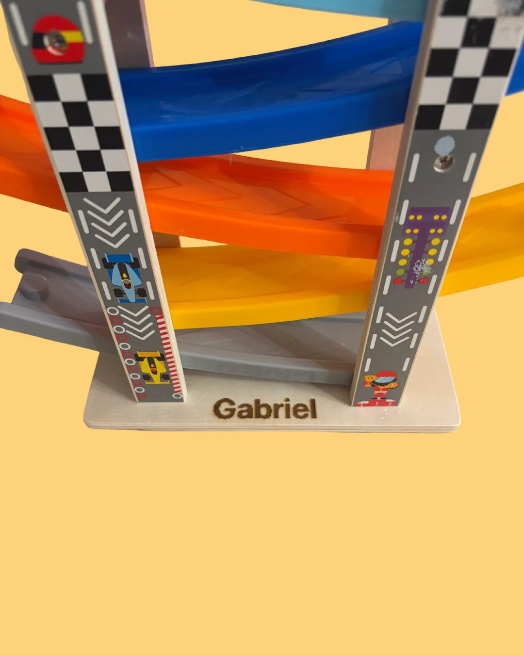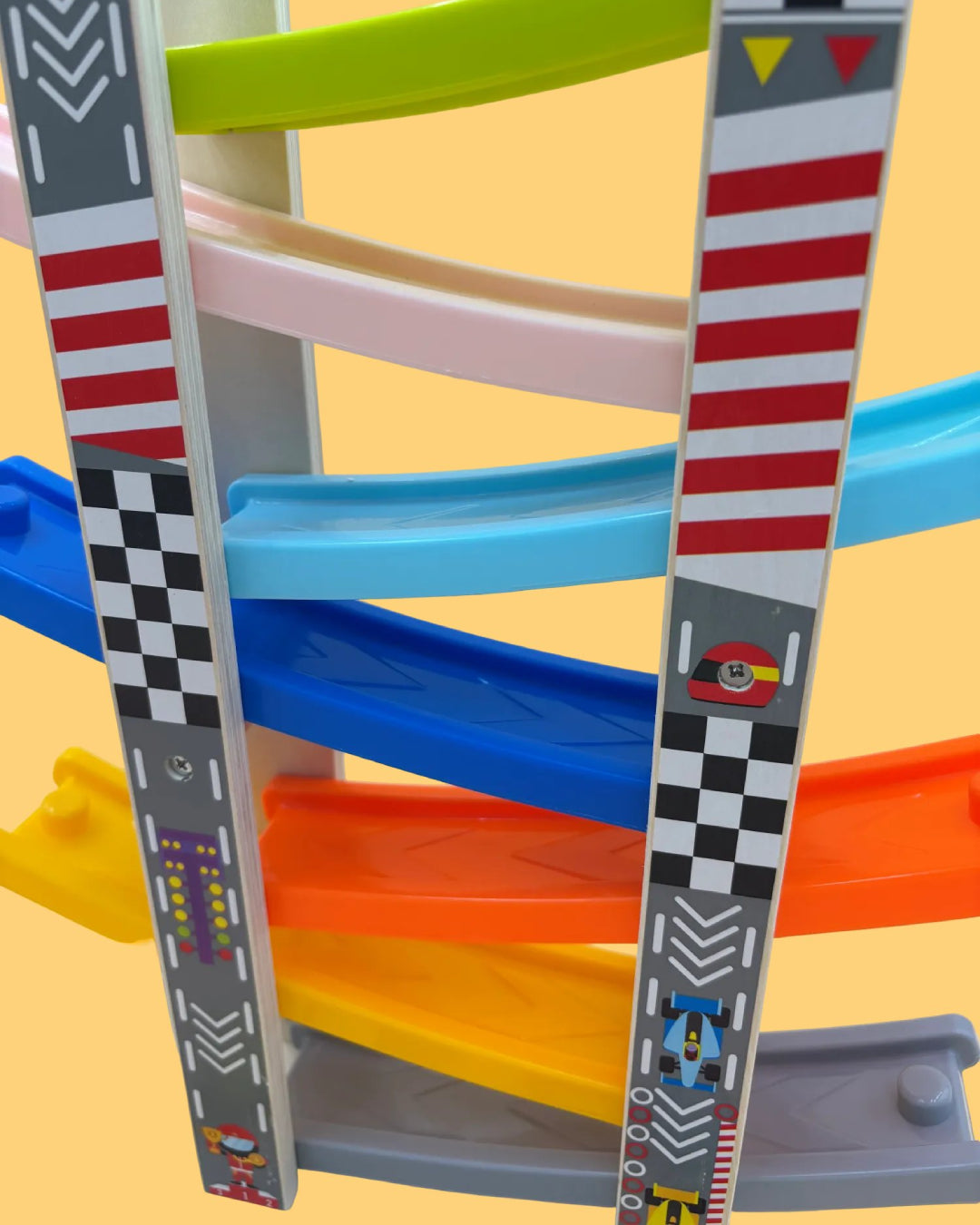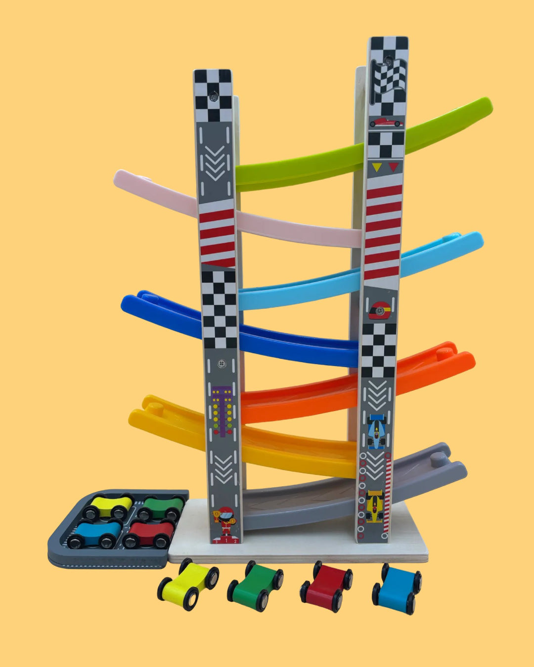 Sortez le circuit en bois et les voitures de la boîte. Placez le circuit à plat sur une surface stable. Choisissez une voiture et placez-la sur la première rampe. Regardez-la descendre et enchaîner les rampes en cascade.